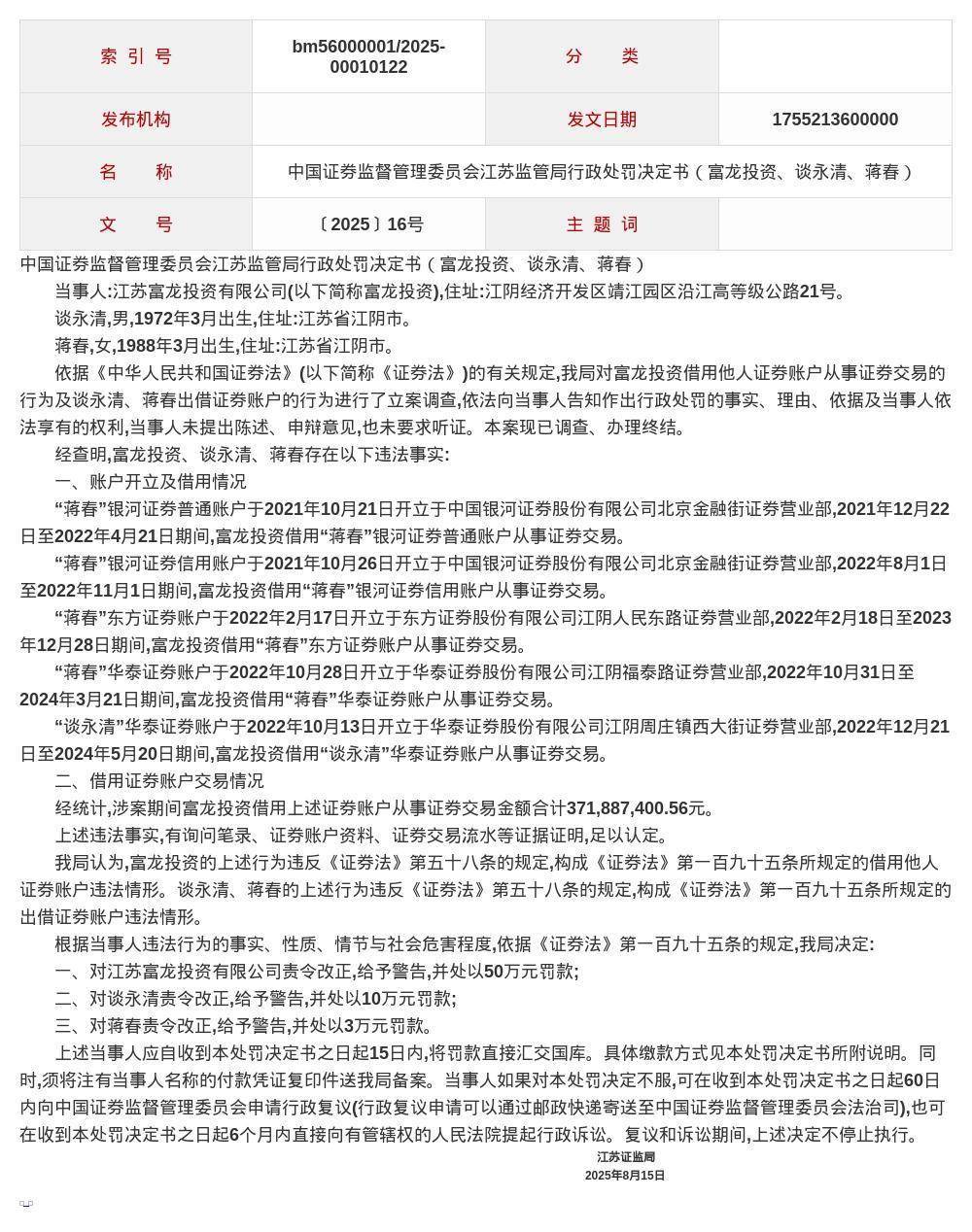 针对以上问题,江苏证监局决定:对富龙投资责令改正,给予警告,并处以50万元罚款;对谈永清责令改正,给予警告,并处以10万元罚款;对蒋春责令改正,给予警告,并处以3万元罚款。